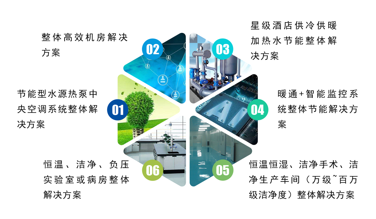 主要为写字楼、政府机关、酒店宾馆、医院、厂房、数据中心、商业体超市、餐饮娱乐等场所提供了专业整体的中央空调暖通系统解决方案;
